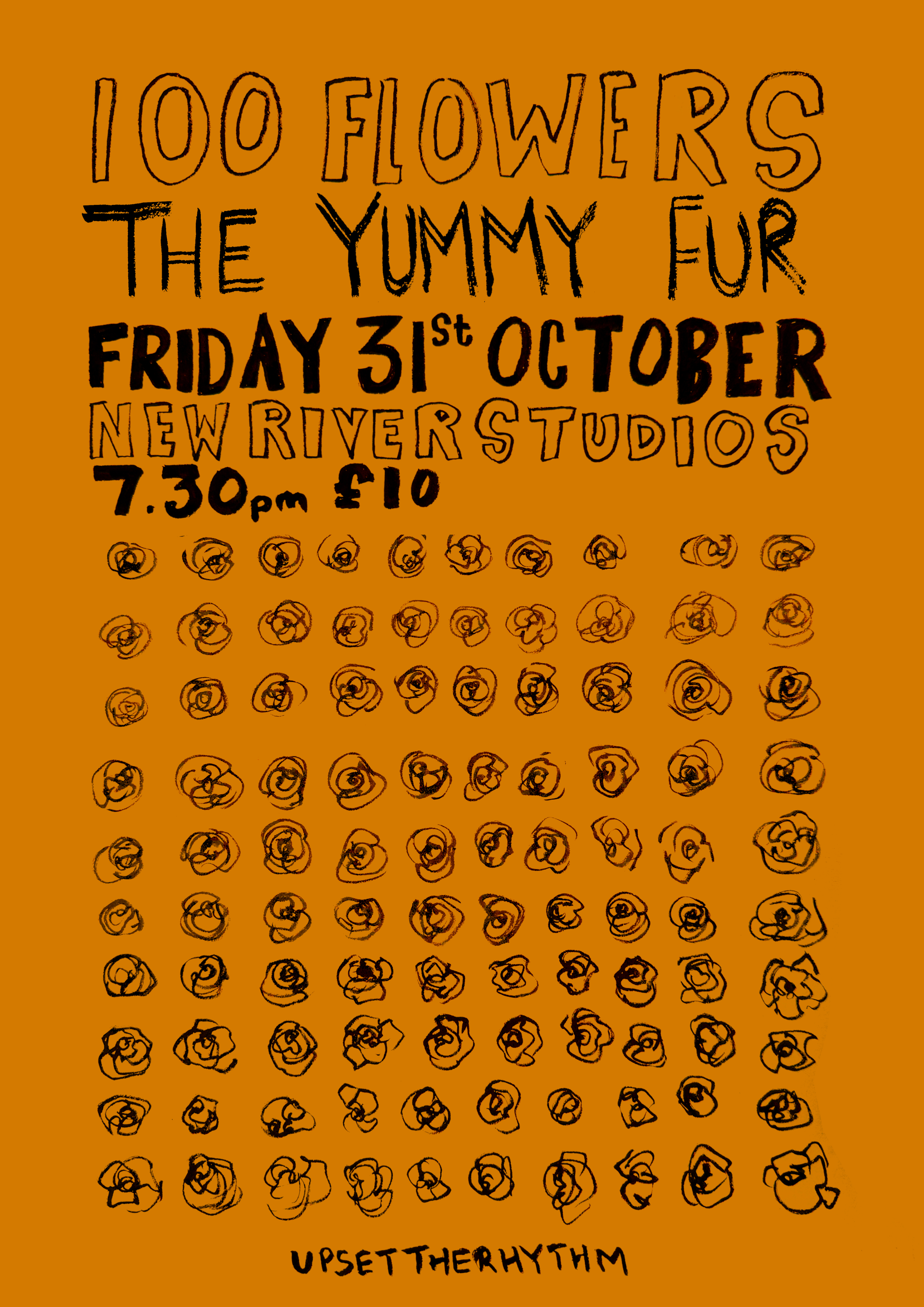 I hope you're all getting into the Halloween swing of things by donning capes and fangs. Our next show falls on All Hallows' Eve, this Friday, and sees an immense double-headline from two of our very favourite bands: 100 Flowers and The Yummy Fur.
