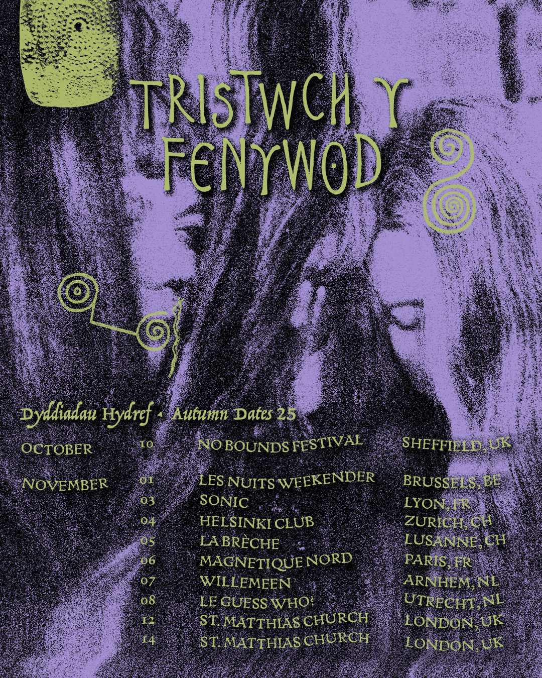 TRISTWCH Y FENYWOD is a band of three queer women who play avant garde gothic music using dual-zither, bass and electronic drums. Their lyrics are sung entirely in the Welsh language (Cymraeg), and flicker in the moon-glow. Tristwch y Fenywod (translated as… The Sadness of Women) are Gwretsien Ferch Lisbeth (Guttersnipe, Petronn Sphene), Leila Lygad (Hawthonn) and Sidni Sarffwraig (Slaylor Moon, The Courtneys). Formed in 2022 in Leeds, where the band are primarily based, Tristwch y Fenywod sounds like an early 4AD group dredged from the waters of an Anglesey swamp. Sapphic love and desire, existential darkness, political and environmental anguish/celebration, psychogeographic romance, pagan mysticism, imaginal explorations of Celtic history and myth, psychedelia, and myriad other variations of reverie are fantasised through their songs.